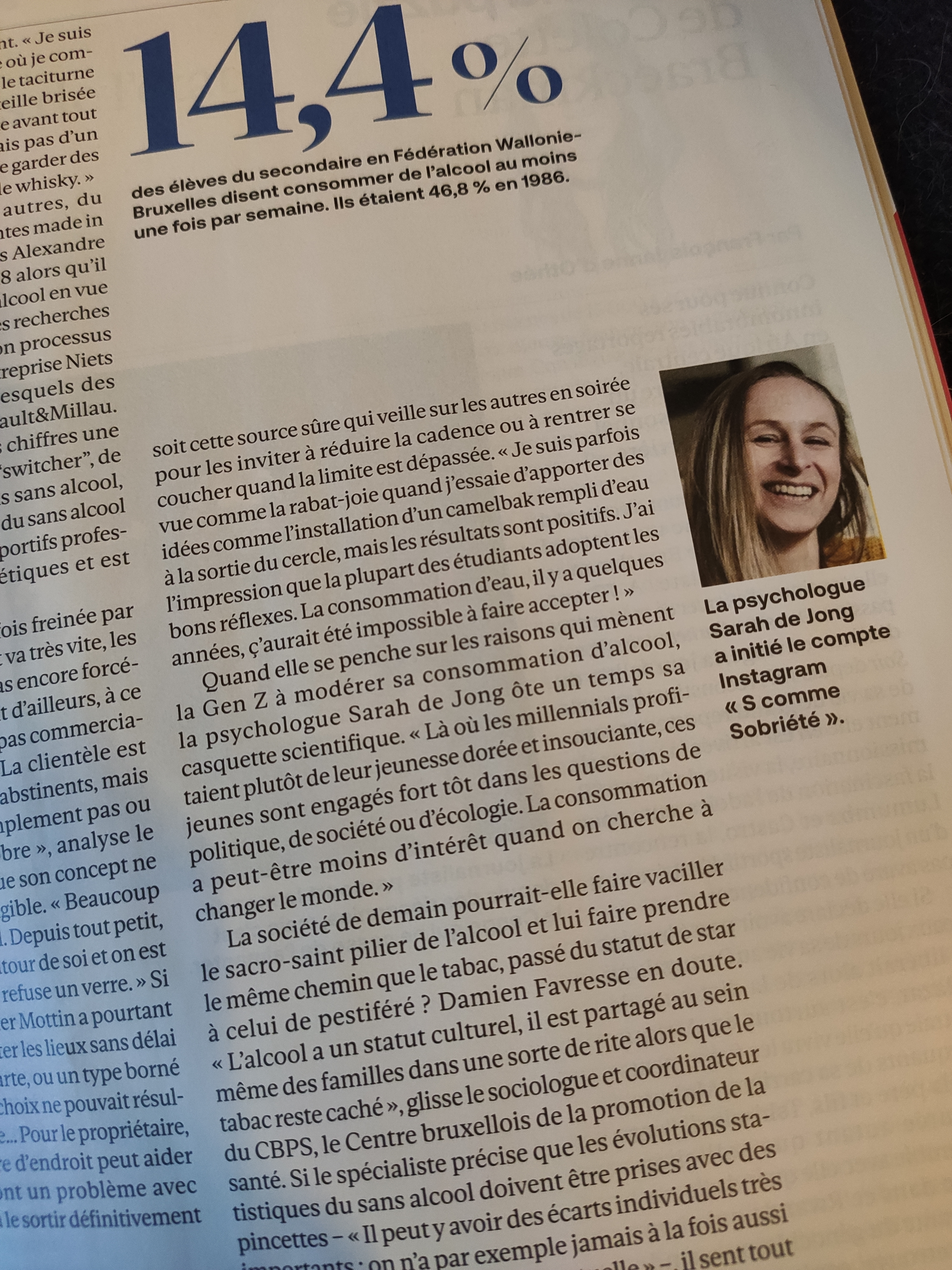Le Vif, « Ces jeunes qui rejettent l’alcool, enquête », numéro du 4 janvier 2024.